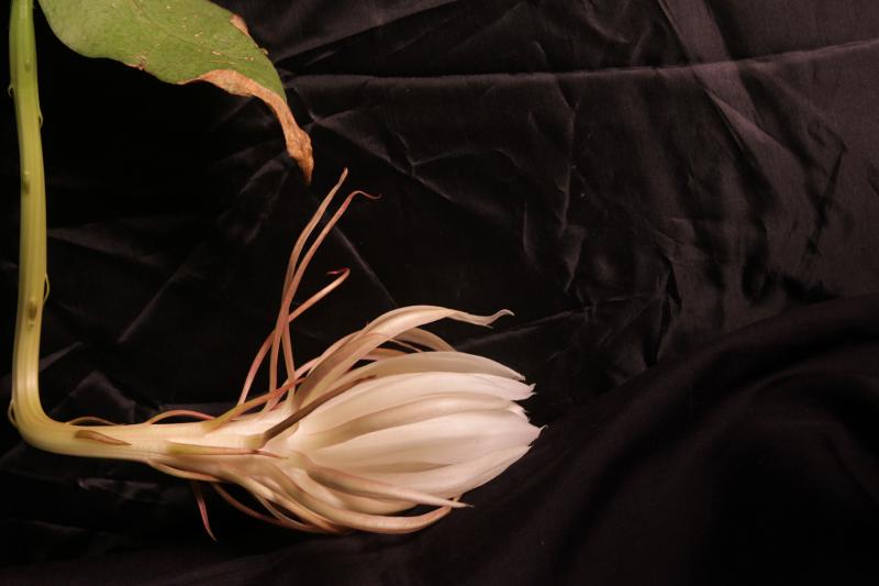 “There it is,” she says, gazing down at the swollen bud of an orchid cactus. “It’s slowly opening.”
