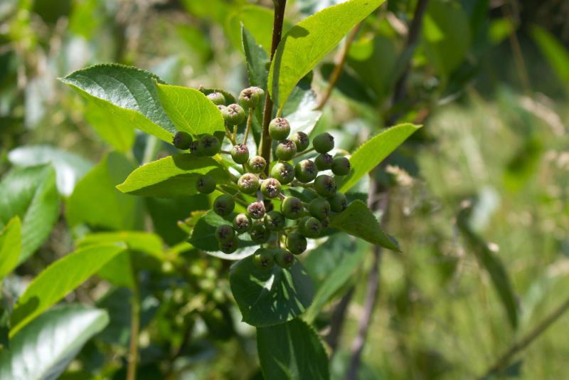 Peggy Fogle and her dog, Abe, walk among rows of aronia berry bushes on the family property outside Carlisle, Iowa. Plants on the ends of rows are smaller from years of being nibbled by deer and rabbits. But on nearly nine acres, filling four separate fields, the bushes are reaching maturity, eight years after Fogle and her husband decided to put in their first ones.